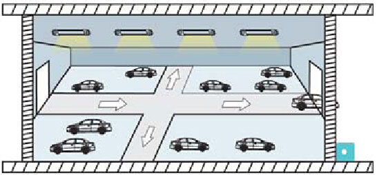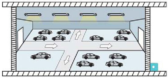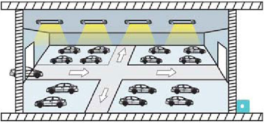 車庫里有多個帶感應器的燈具,只要有一個感應器感應到運動信號,同一過道里的燈全部點亮。