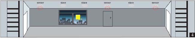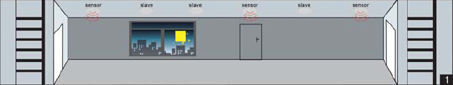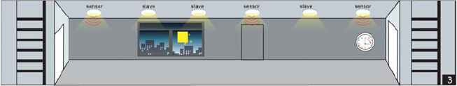 走廊的燈是由幾個感應器控制的。只要有一個感應器感應到運動信號,就會把信號傳輸給連接在一起的其他感應器,然后所有燈同時亮。