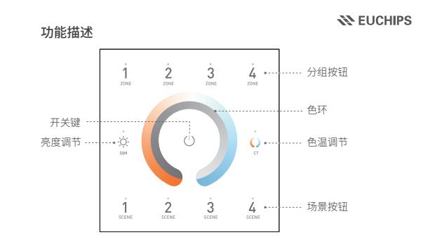 CT:打開面板后,點擊CT按鍵,激活色溫調節功能。色環可調節燈具色溫,沿環順時針觸