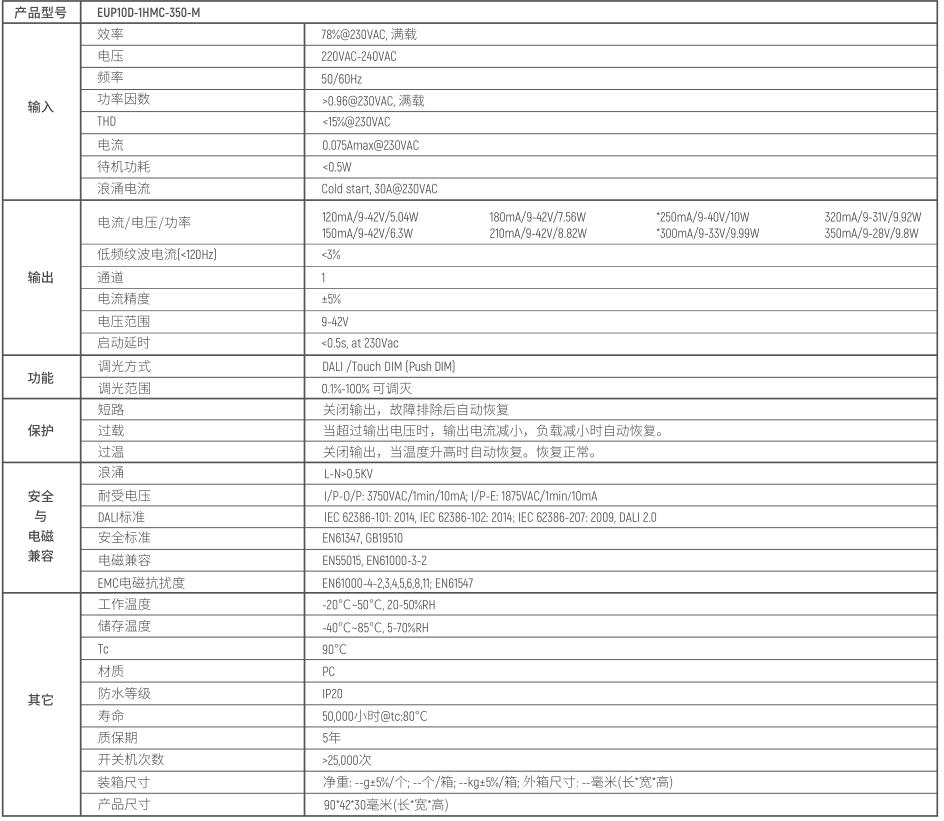 EUP10D-1HMC-350-M是一款恒流輸出模式LED驅動器。調光信號和輸入及輸出隔離,完全符合新標準要求,確保用戶在燈具系統安裝及使用中的安全。