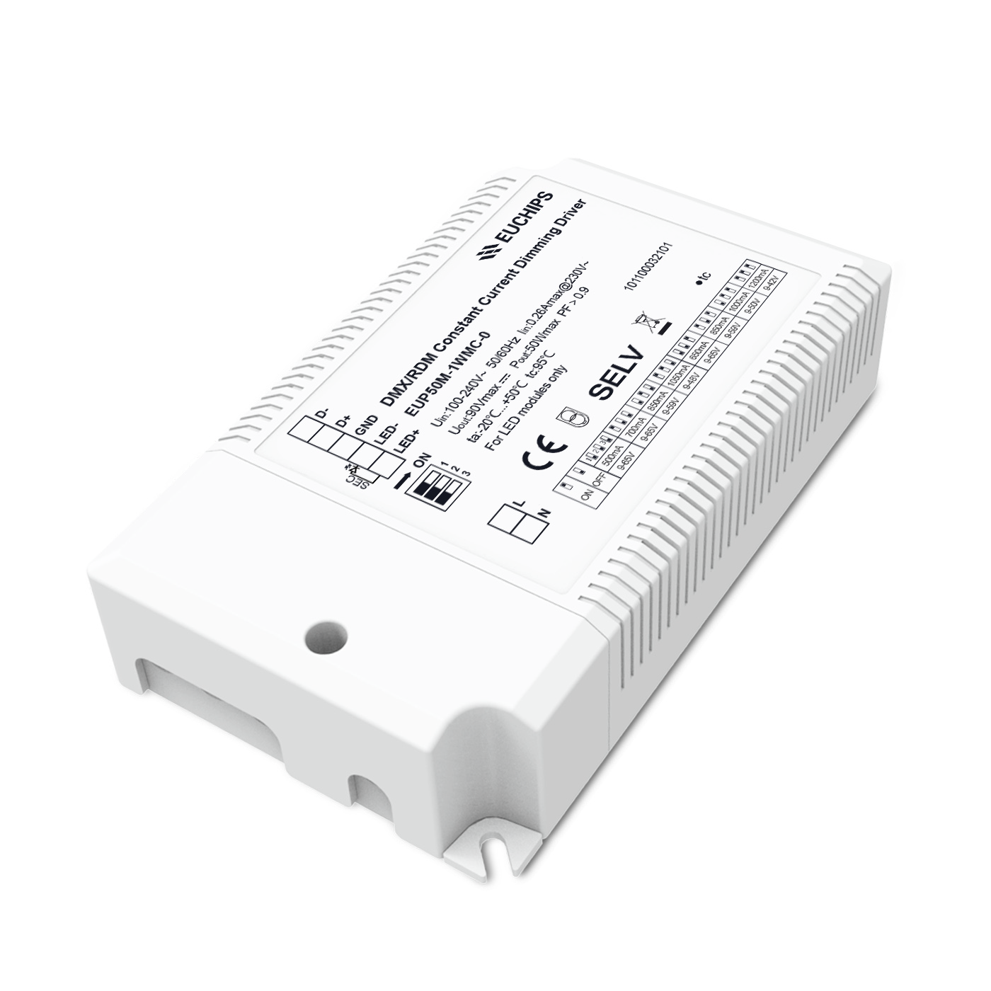 EUP50M-1WMC-0 是一款可以提供 500/650/700/850/1000/1050/1200mA 7 檔電流的 LED 驅動器。輸出電流可以通過DIP 撥碼開關簡易設置,可以通過 DMX 主控或 RDM 主控實現平滑的調光效果。