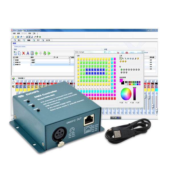 聯機和獨立模式512通道 全彩DMX控制器DMX-Q02是一套用于控制建筑室內外亮化的全彩LED DMX控制系統,可以在聯機和獨立兩種模式下工作。它包含場景編輯程序,根據不同的需求可以通過電腦下載的程序編輯各種燈光效果。該控制系統實現R,G,B各256級灰度,共可表現1677萬種顏色,真正顯示全彩色。
