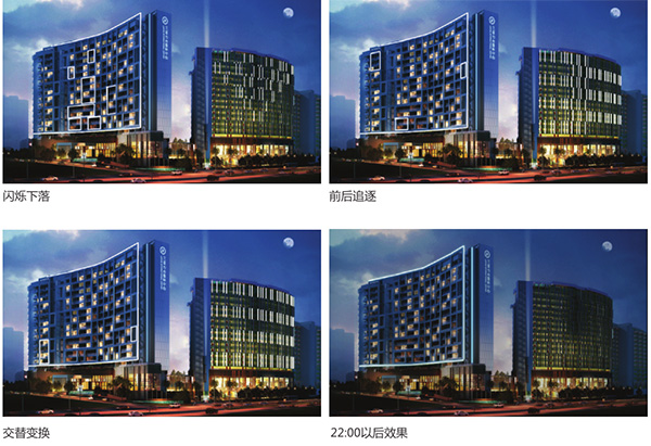 節假日模式:從大樓底層到頂端32層的追逐式燈光照明,渲染節日氣氛。燈光會進行有序變幻,閃爍,呼吸,追逐等。