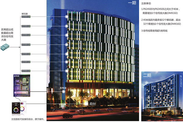 應用分析:此案例中采用歐切斯DMX主控DMX-P06,解碼器px24500和信號放大器DMX-102。
