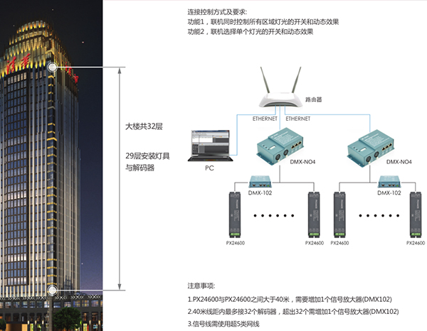 應用分析:案例采用歐切斯主控DMX-N04 配合解碼器PX24600以及信號放大器DMX-102。