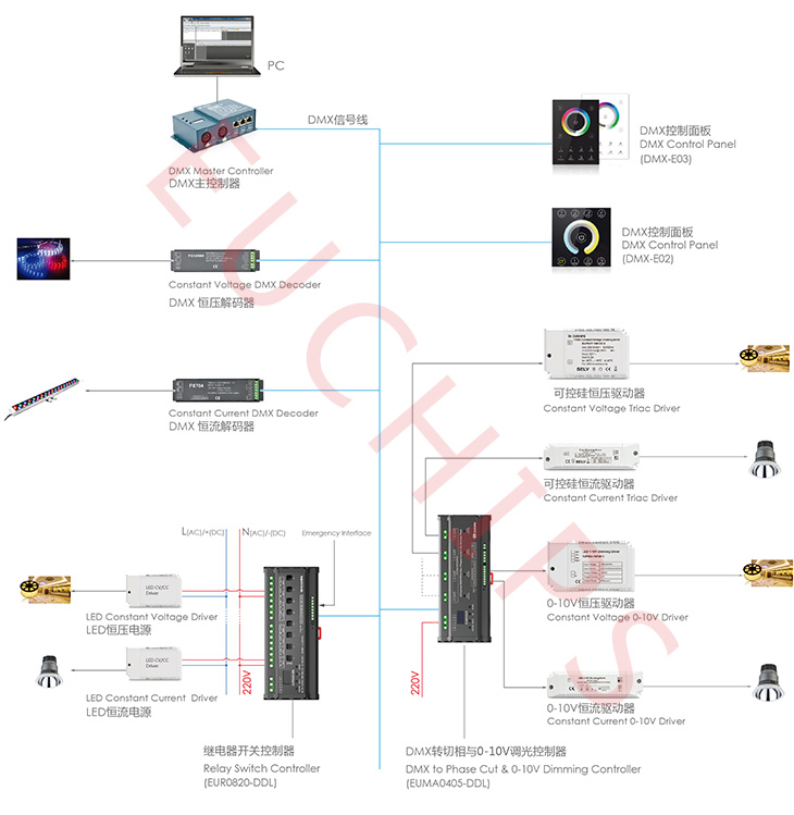 下圖是上海歐切斯實業有限公司的DMX控制系統實物圖。圖中dmx恒壓解碼器和dmx恒流解碼器均對應為上圖中的dmx512控制器。