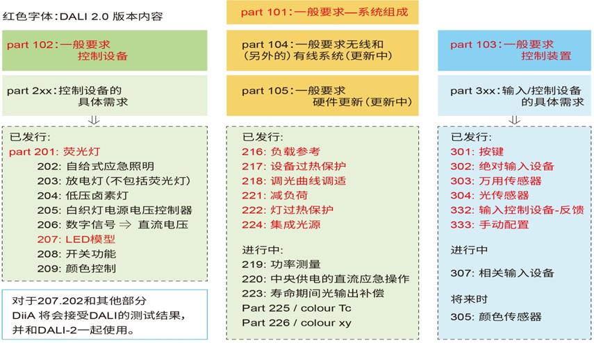 隨著 DALI 標(biao)準和照(zhao)明產品(pin)的(de)(de)發展(zhan),獨立的(de)(de)標(biao)準 IEC 62386 協議(yi)又(you)可以區分為 DALI version-1 和 DALI-2 兩個大的(de)(de)版(ban)本。