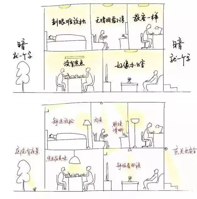 使用最少的燈具,用最便宜的方式達到生活所需的亮度。雖然這能省錢,但也會帶來一些問題。一盞燈滿足不了對照明的需求。不同場所需要實現不同的功能,適用的照明形式也不同。合理的燈光布局不僅可以讓空間更加美觀,更能增強人們的幸福感。