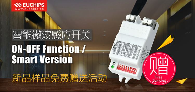 本次贈送樣品為一款最新的智能微波感應開關系列產品,型號為:EUC030S.本產品是一款家居型的微波感應智能控制開關產品,采用先進的高科技軍工技術,有效過濾其它空間信號干擾,識別人體雷達信號,以全智能的方式來控制燈具(或其它負載)開關。擁有體積小巧,便于隱藏安裝在燈具里的特性,可以匹配各品牌LED 驅動和鎮流器實現感應開關功能,非常的實用,并且簡單方便!