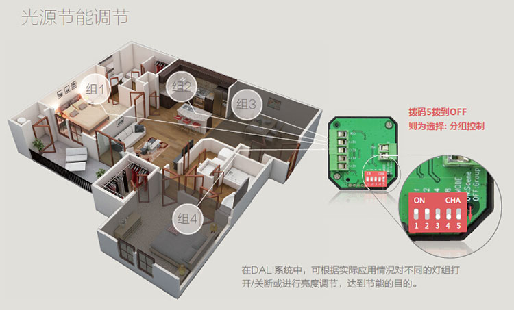 5、 光源(yuan)節(jie)(jie)(jie)能(neng)調節(jie)(jie)(jie)。在DALI系(xi)統中,可根據(ju)實(shi)際應用情況對不同的燈組(zu)打開/關斷或進(jin)行(xing)亮度調節(jie)(jie)(jie),達到節(jie)(jie)(jie)能(neng)的目(mu)的。