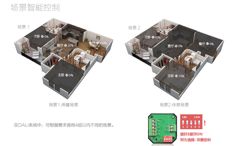 4、 場景智能控制。在DALI系統中(zhong),可(ke)根據(ju)需求調用4組(zu)以內不同的場景。