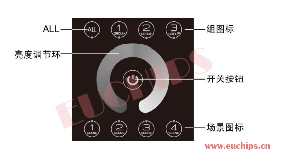| GROUP 1:選擇起始組的燈,起始組號可通過背面的撥碼開關進行設置。 | GROUP 1:選擇起始組的燈,起始組號可通過背面的撥碼開關進行設置。 短按選中Group1,指示燈亮起,可以直接調節亮度或者進入指定場景;如果Group1選中,指示燈亮起,長按Group1,Group1燈具全部關閉。 |