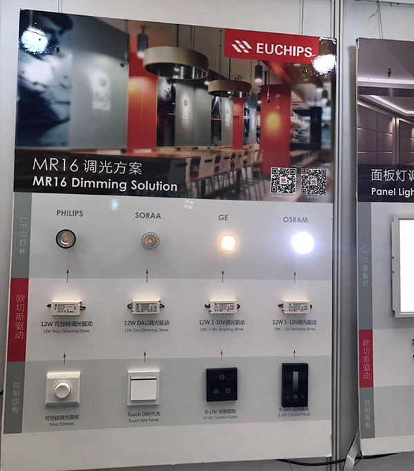 這個展板(ban)上,歐切斯帶來(lai)了可控硅(gui),DALI 以及1-10V調(diao)光(guang)(guang)電(dian)源匹配四種品牌的(de)(de)MR16調(diao)光(guang)(guang)方案,完美解(jie)決了實際應(ying)用過程(cheng)中的(de)(de)啟亮(liang)點高,低端閃爍,調(diao)光(guang)(guang)范圍窄等不(bu)兼容的(de)(de)問題。另外(wai)還(huan)有燈帶,筒燈,面板(ban)燈的(de)(de)調(diao)光(guang)(guang)方案展示。