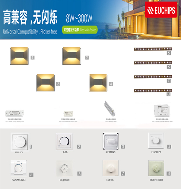 采用不同品牌的主控旋鈕(飛利浦,ABB,西門子,正泰,德力西,松下,施耐德,羅格朗)與歐切斯可控硅調光電源的(de)(de)匹配調(diao)光(guang)效果(guo)。歐切(qie)(qie)斯獨家(jia)的(de)(de)可(ke)控硅(gui)技術解決了(le)可(ke)控硅(gui)的(de)(de)兼容性(xing)(xing)(xing)問題:調(diao)光(guang)時有(you)(you)噪音,有(you)(you)最低負載要求,調(diao)光(guang)范圍窄這些痛點,支(zhi)持前后沿切(qie)(qie)相調(diao)光(guang),兼容性(xing)(xing)(xing)好,支(zhi)持絕(jue)大部(bu)分(fen)的(de)(de)主控品牌,調(diao)光(guang)范圍寬,能根(gen)據主控的(de)(de)特(te)性(xing)(xing)(xing)來修改調(diao)光(guang)曲(qu)線,沒有(you)(you)最低負載要求。