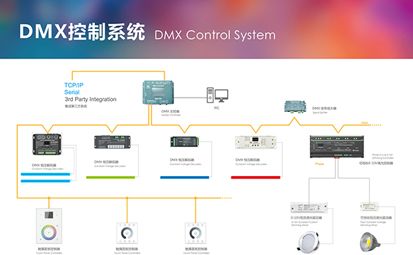 DMX系統中的(de)多(duo)種調(diao)光控制面(mian)板,多(duo)通道的(de)解碼(ma)器,以及DMX和(he)傳統0-10V,切(qie)相調(diao)光的(de)轉換器。具(ju)備(bei)頻率(lv)切(qie)換功能的(de)解碼(ma)器,能滿足了(le)客(ke)戶無(wu)頻閃(shan)的(de)需求。全(quan)新的(de)主控,植入外部485協議和(he)干(gan)觸點的(de)功能,銜接(jie)第三方中控系統,主控還滿足局(ju)域網多(duo)臺互聯的(de)功能,保證了(le)輸出效果(guo)的(de)同(tong)步性(xing)。