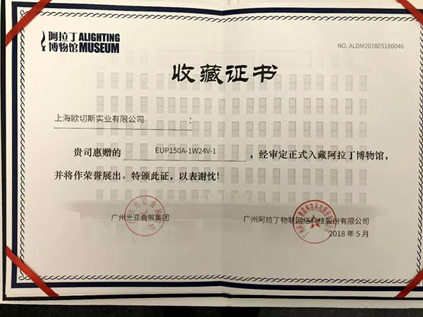 值(zhi)得一提的是:歐切斯0-10v調光電源EUP150A-1W24V-1,被(bei)阿拉丁博物館收(shou)藏。并獲得榮(rong)譽證書,祝賀(he)!