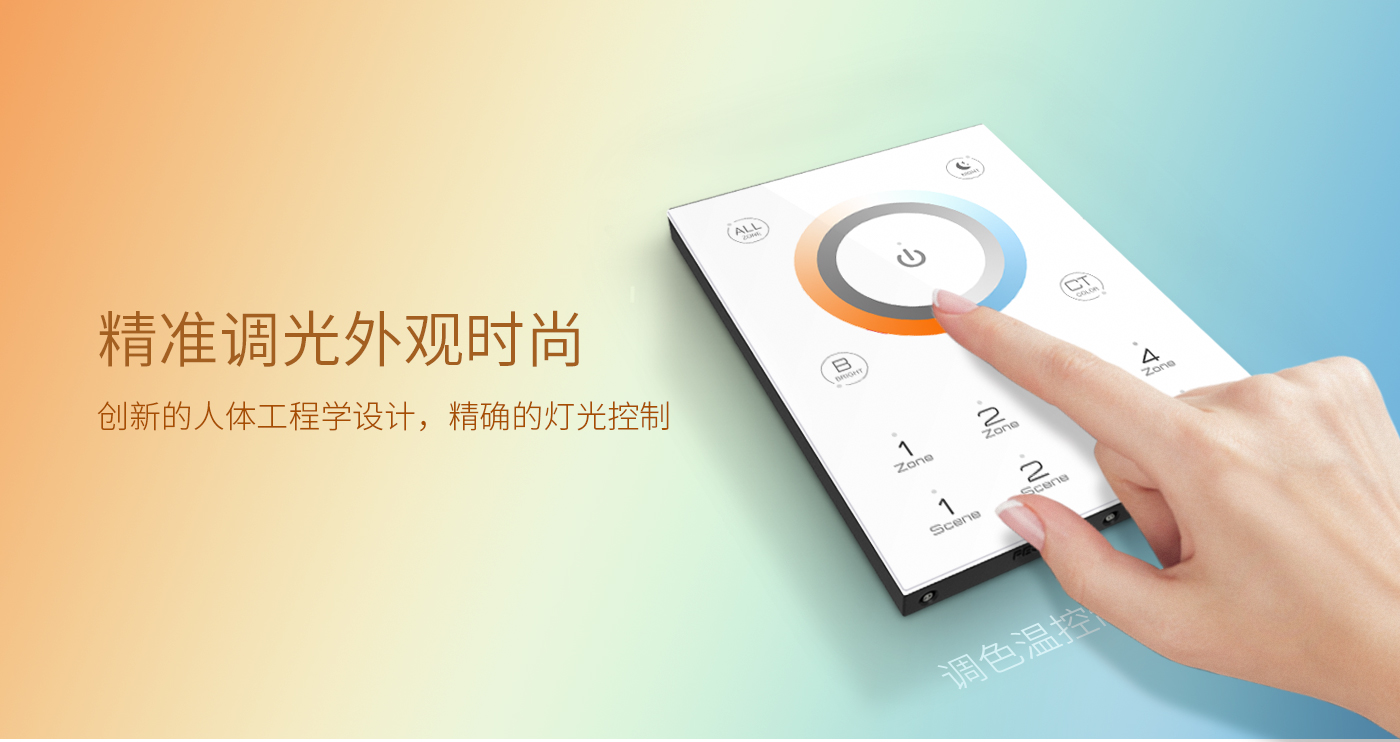 調光控制器面(mian)板界(jie)面(mian)簡介清晰(xi),控制精細。高(gao)靈敏度玻璃觸摸(mo)按鍵(jian)及調節滑環,使(shi)用功能(neng)一目了然,更方(fang)便操作(zuo)控制。