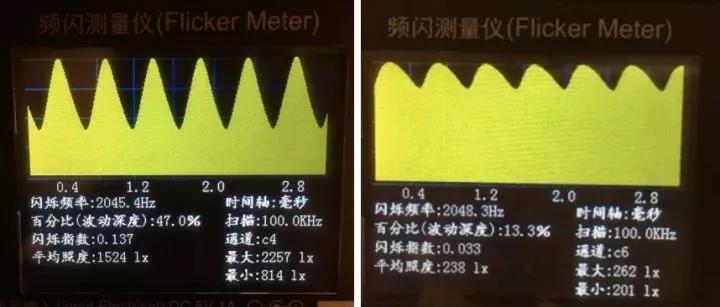 結論 不調(diao)光時,頻(pin)閃(shan)幾乎為零。調(diao)暗時,電(dian)源采用2K Hz的高頻(pin)調(diao)制,數據落(luo)在無影響(xiang)區域,可叫做(zuo)“無頻(pin)閃(shan)”。在現場目視也(ye)未(wei)見閃(shan)爍。