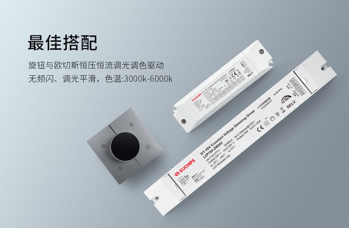 搭配歐切斯恒壓/恒流調光調色溫電源,可實現千分之一深度調光,全程調光平滑自然,無頻閃;色溫范圍為3000K~6000K,光色柔和,人在此色溫下視覺舒適。一個如此簡單的旋鈕面板也會讓人如此著迷!
