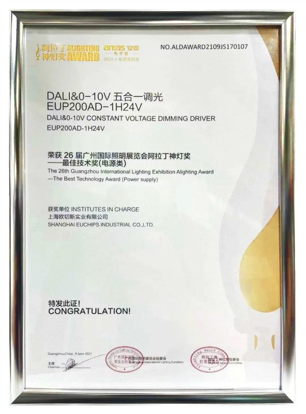 此次2021光亞展期間,第九屆阿拉丁神燈獎頒獎典禮也在廣州琶洲中國進出口交易會展館隆重舉行。歐切斯榮幸受邀以光之名,赴榮耀之約與業界大咖、學界專家、精英企業代表齊聚一堂。照明行業電源類唯二的【最佳技術獎】,其中之一被歐切斯摘得,這是對歐切斯品牌與產品實力的認可與肯定!作為國內LED調光電源及控制系統的供應商和智能照明方案服務商,歐切斯專注調光16年,產品研發立足“高兼容,無頻閃”,力求精準控制每一盞燈,讓未來更加節能與便捷!