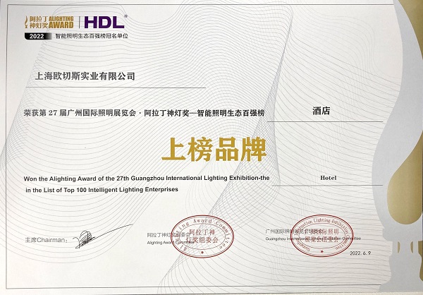 “有著照明行業奧斯卡獎”之稱的2022阿拉丁神燈獎頒獎盛典舉行,通過評獎頒獎樹立領域標桿,發掘、匯聚行業先進產品、技術、設計及項目案例成果。歐切斯榮登酒店場景生態圈百強榜,作為行業權威獎項,又是對歐切斯智能調光的一次肯定與認可。
