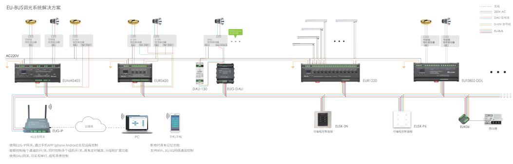 EU-BUS系統由系統設備、輸出設備、輸入設備三部分組成。系統設備:系統時鐘及與其他系統對接的接口,如網關模塊,時鐘模塊,接口模塊等。輸入設備:將外部控制信號轉換成系統網絡上的傳輸信號,如面板開關,傳感器等。輸出設備:智能系統的輸出設備是用于接收來自網絡傳輸的信號,控制相應回路的輸出以實現實時控制。