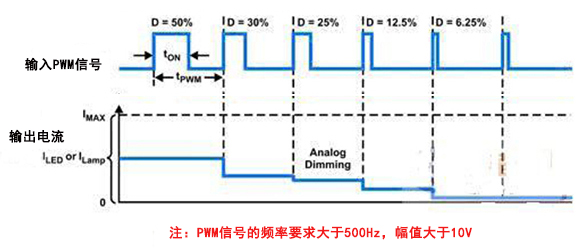 脈寬調制(PWM)調光:要求PWM信號的頻率要求大于500Hz,幅值大于10V。通過用改變脈沖寬度的方法,來改變其亮度。下圖表示這種輸入PWM信號和輸出電流示意圖: