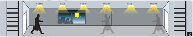 走廊的燈是由幾個感應器控制的。只要有一個感應器感應到運動信號,就會把信號傳輸給連接在一起的其他感應器,然后所有燈同時亮。