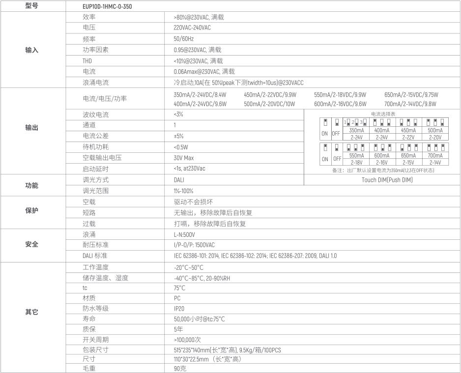 EUP10D-1HMC-0-350是本公司一款可以提350/400/450/500/550/600/650/700mA 8檔電流的LED驅動器。輸出電流可以過DIP撥碼開關簡易設置, 符合DALI標準協議IEC62386.