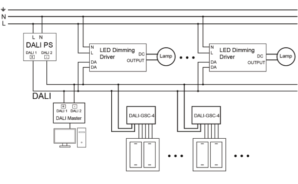 ●通常,每個DALI電源或控制器消耗電流為2 mA,64個電源或控制器總共消耗128mA,剩余部分給不帶內置電源的DALI控制器(包括DALI 面板,DALI分組/場景控制器)供電。