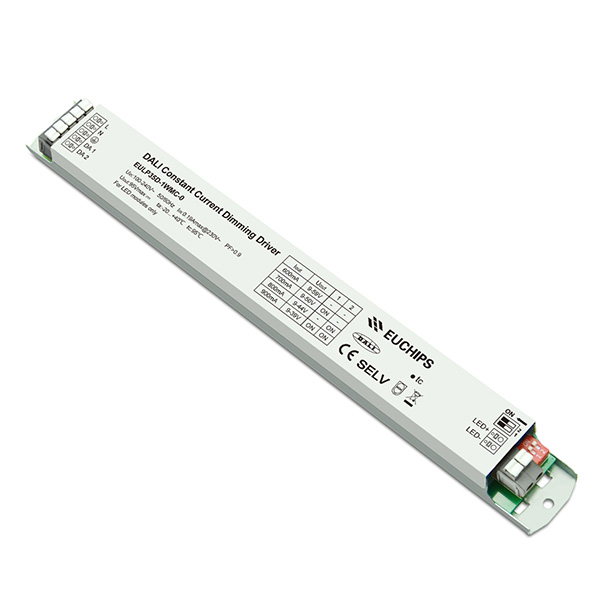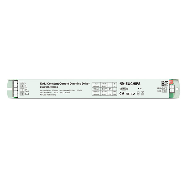 EULP35D-1WMC-0一款35W交流變直流LED調光電源,輸出電流可以通過DIP開關選擇,符合DALI標準協議IEC62386。連接DALI主控或Touch DIM可以實現平滑的調光效果。