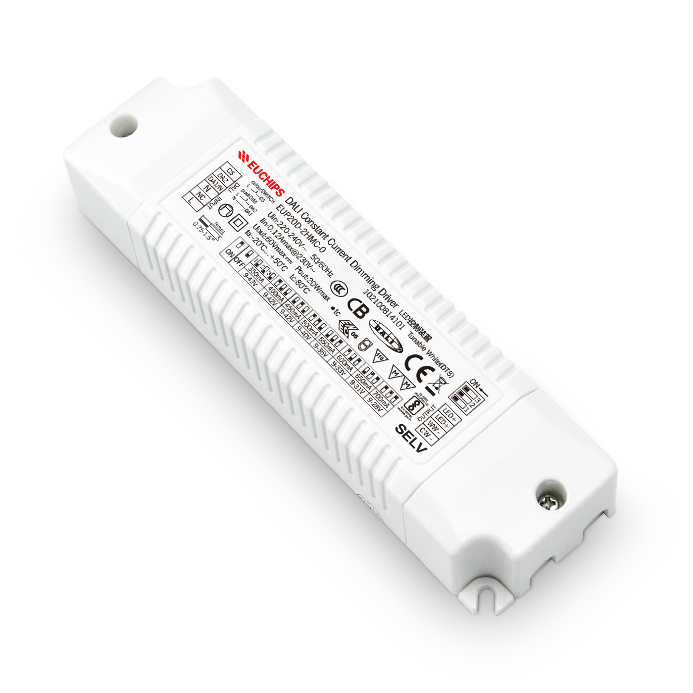 EUP20D-2HMC-0 是一款可以提供兩路輸出,350/400/450/500/550/600/650/700mA 8檔電流的LED驅動器。輸出電流可以通過DIP撥碼開關簡易設置,用DALI主控/Touch DIM開關調光,曲線平滑、無閃爍。產品特點