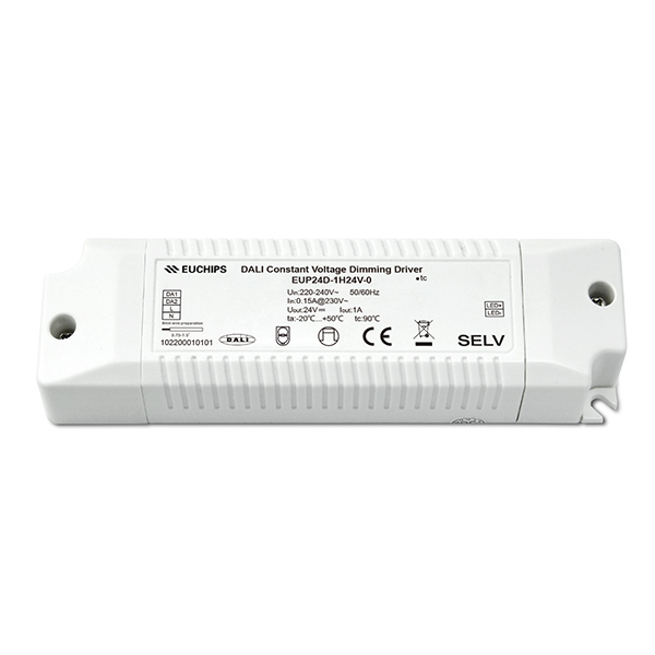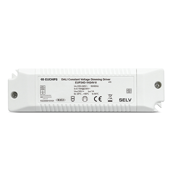 EUP24D-1H24V-0是一款可以用于室內的24W 24VDC DALI恒壓調光電源。符合DALI標準協議IEC62386。這款驅動器可以通過連接DALI主控或Touch DIM可以實現平滑的調光效果。