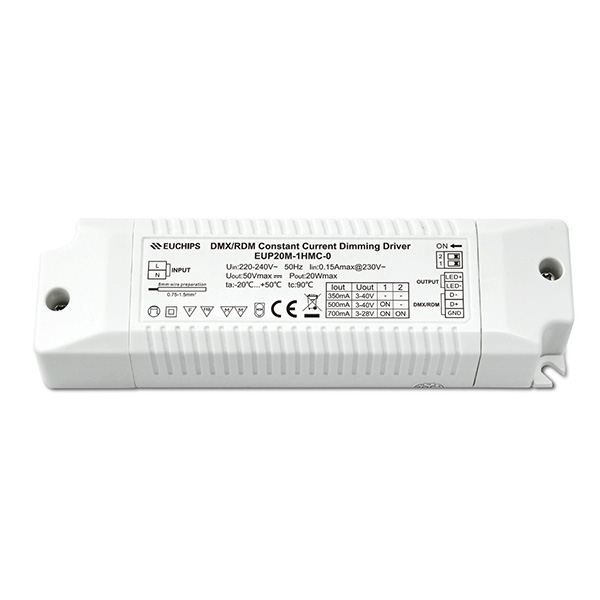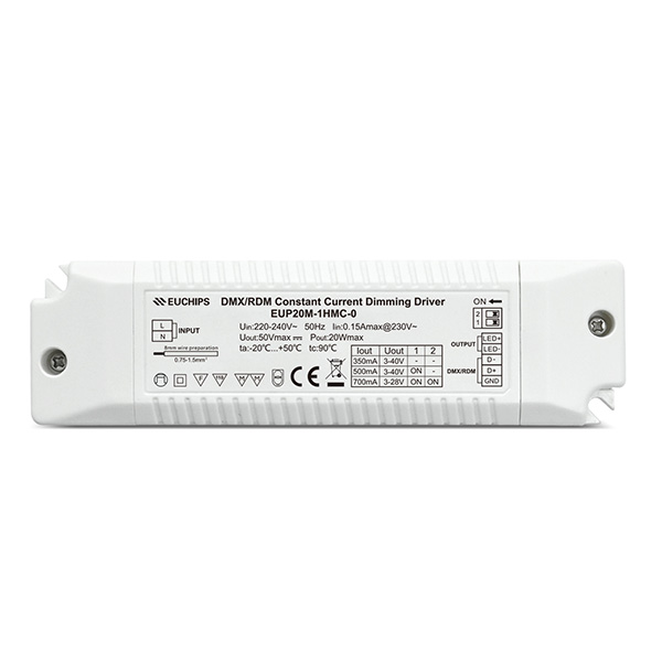 EUP20M-1HMC-0 是一款可以提供350/500/550/700mA 4 檔電流的DMX/RDM 恒流調光驅動器,輸出電流可以通過DIP 撥碼開關簡易設置,可以通過DMX512/RDM 控制實現平滑的調光效果。
