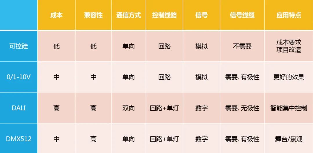 以歐切斯為例,歐切斯電源大多都是以有線調光為主,下面是幾款經典調光方式優缺點對比: