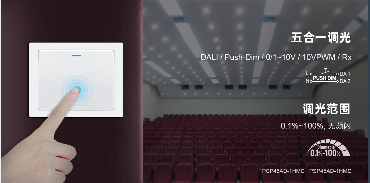 兩(liang)款新品(pin)電(dian)源(yuan)都(dou)支持五(wu)合(he)一調光:DALI、PWM、0/1-10V/Push-Dim、Rx。調光范圍(wei)0.1%-100%,無頻閃,讓用戶擁有更(geng)多的(de)選擇。