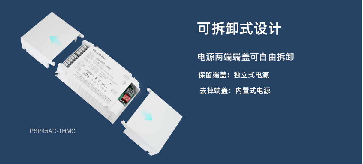 PSP45AD-1HMC 電(dian)源兩端(duan)端(duan)蓋可(ke)以自由拆卸,保(bao)留(liu)端(duan)蓋可(ke)以作為獨立式電(dian)源使(shi)用,去除端(duan)蓋后可(ke)以作為內(nei)置(zhi)式電(dian)源使(shi)用。