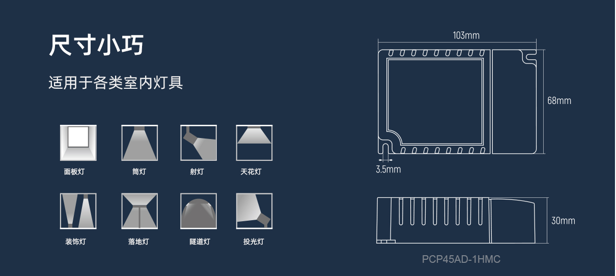 這兩款調光電源尺寸小(xiao)巧,適(shi)用于各(ge)種室內LED燈(deng)具,PCP45AD-1HMC尺103*68*30mm,可以內置(zhi)于面板燈(deng)內部。