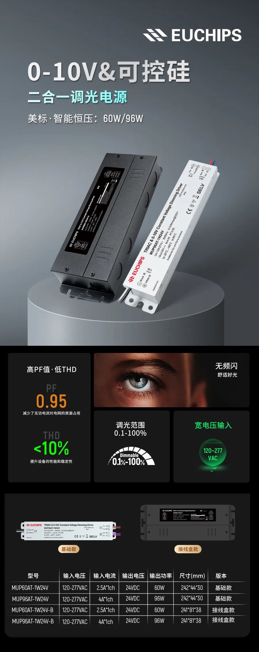 2. 調光范圍0.1%~100%,PF>0.95。