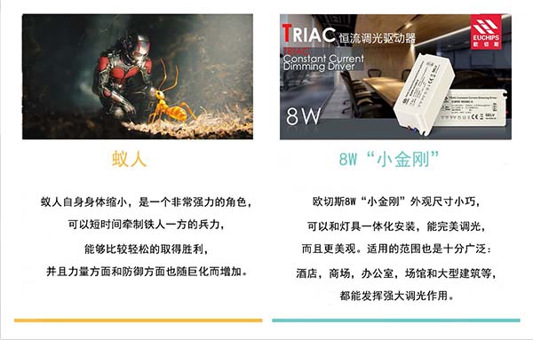 蟻人可以短時間牽制鐵人一方的兵力,變小以后,可以完成異于常人的任務,力量和防御方面也隨巨化而增加。擁有“小金剛”之稱8w可控硅調光電源,外觀體積小巧,可與燈具一體化安裝發揮強大調光作用。