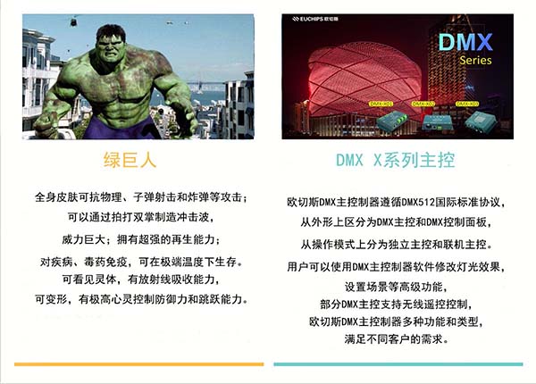 綠巨人浩克有超人的力量、速度、精力和耐力,他的能力與情緒相關,通常是越憤怒越強大。歐切斯DMX512系列主控,和綠巨人一樣綠色大塊頭,調光調色讓燈具實現豐富的色彩變化效果。