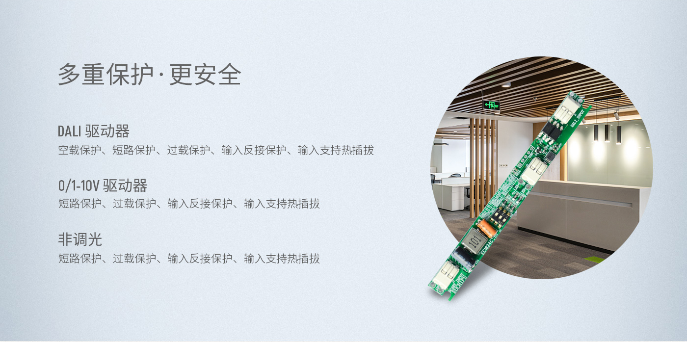 5、多重保護,更安全。DALI驅動器內置:空載保護,短路保護,過載保護,輸入反接保護,輸入支持熱插拔0/1-10v驅動器內置:短路保護,過載保護,輸入反接保護,輸入支持熱插拔非調光驅動器內置:短路保護,過載保護,輸入反接保護,輸入支持熱插拔6、尺寸小巧:125*14.5*10mm這幾款導軌驅動器最大的特點就是體積超小巧,方便安裝于各種體積狹小的空間內,內置安裝更美觀。