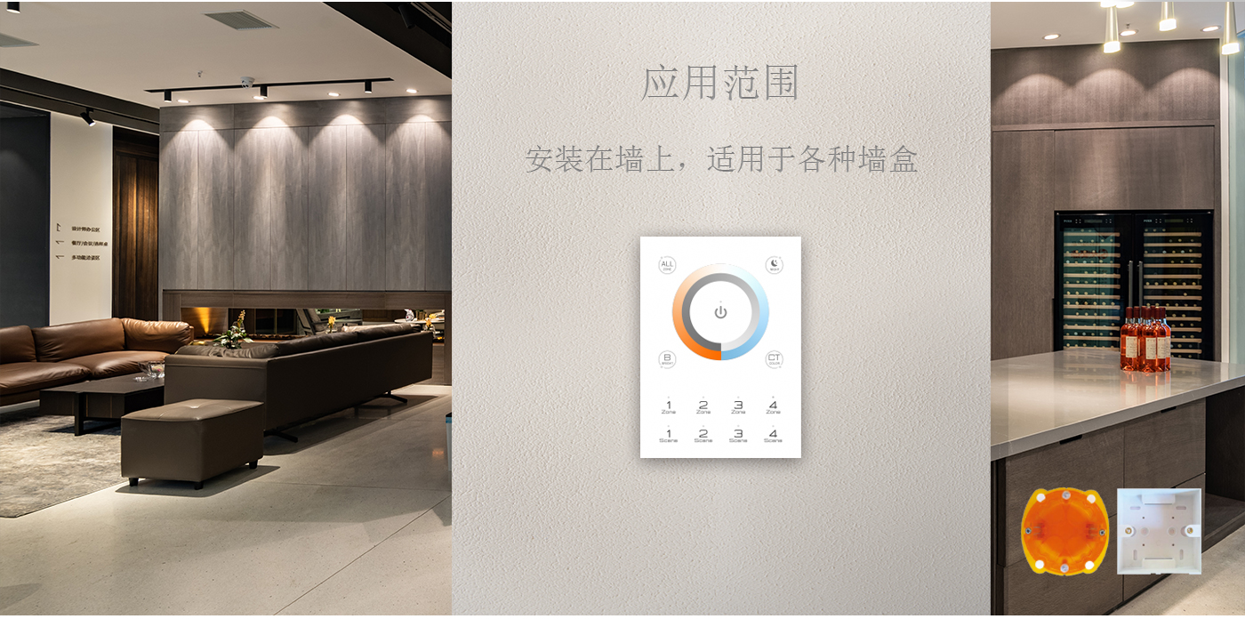 調光控制器(qi)面板有兩種(zhong)類型,長形款:146*106*11(mm),方形款:86*86*10(mm) 安(an)裝于(yu)墻面,適(shi)用(yong)于(yu)各(ge)種(zhong)墻盒,應(ying)用(yong)范圍(wei)廣(guang)泛。 除此之外(wai),歐切斯DMX512主控軟件(jian)自(zi)行開發可(ke)(ke)編(bian)程,可(ke)(ke)實現燈具豐富的(de)色彩變化效果。