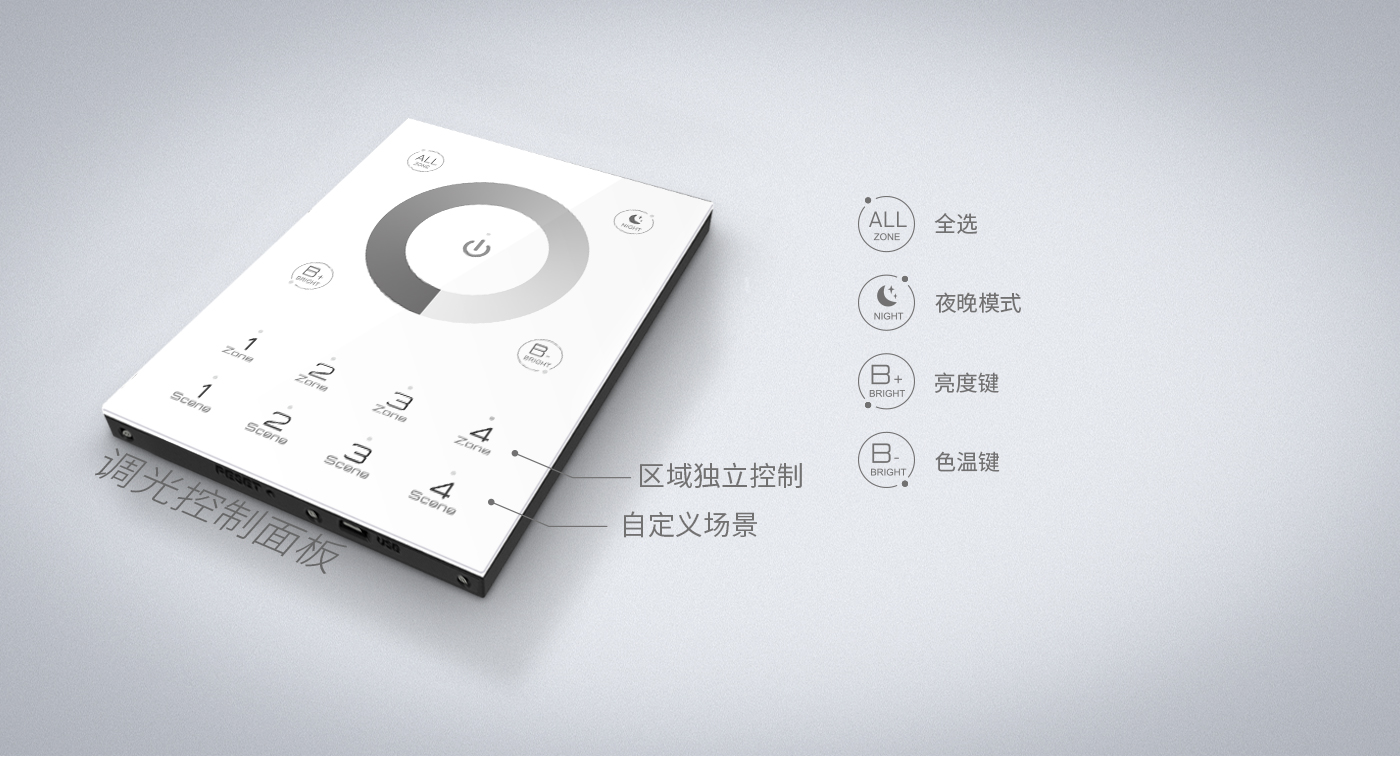 調光控制器面(mian)板界(jie)面(mian)簡介清晰(xi),控制精細。高(gao)靈敏度玻璃觸摸(mo)按鍵(jian)及調節滑環,使(shi)用功能(neng)一目了然,更方(fang)便操作(zuo)控制。