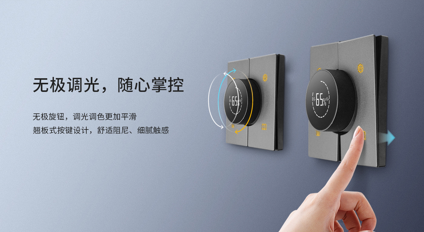 無極旋鈕,操作便捷,智能調光調色溫更加平滑;翹板式按鍵設計,簡約不簡單;舒適阻尼,細膩觸感,方便用戶能更加精準地通過手感調整到自己想要的位置。無論是段落式停頓還是順滑變換,都會讓人摩挲把玩愛不釋手。