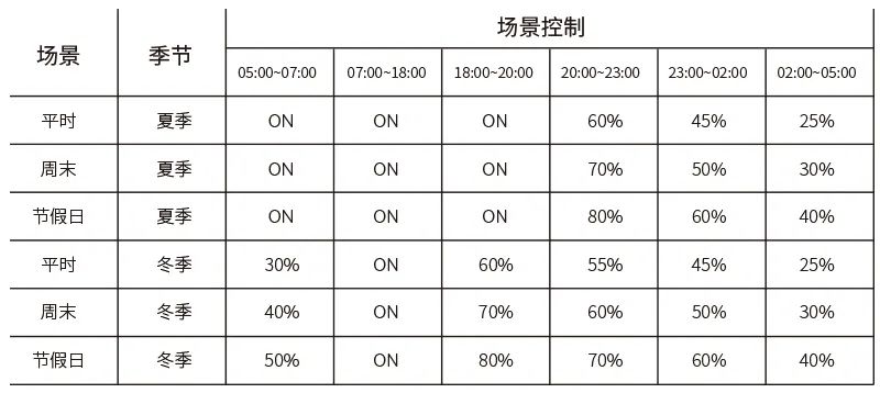 調試場景設置參考:冬季(平時、周末、節假日),夏季(平時、周末、節假日)。具體照明邏輯參數根據現場試燈效果來確定。