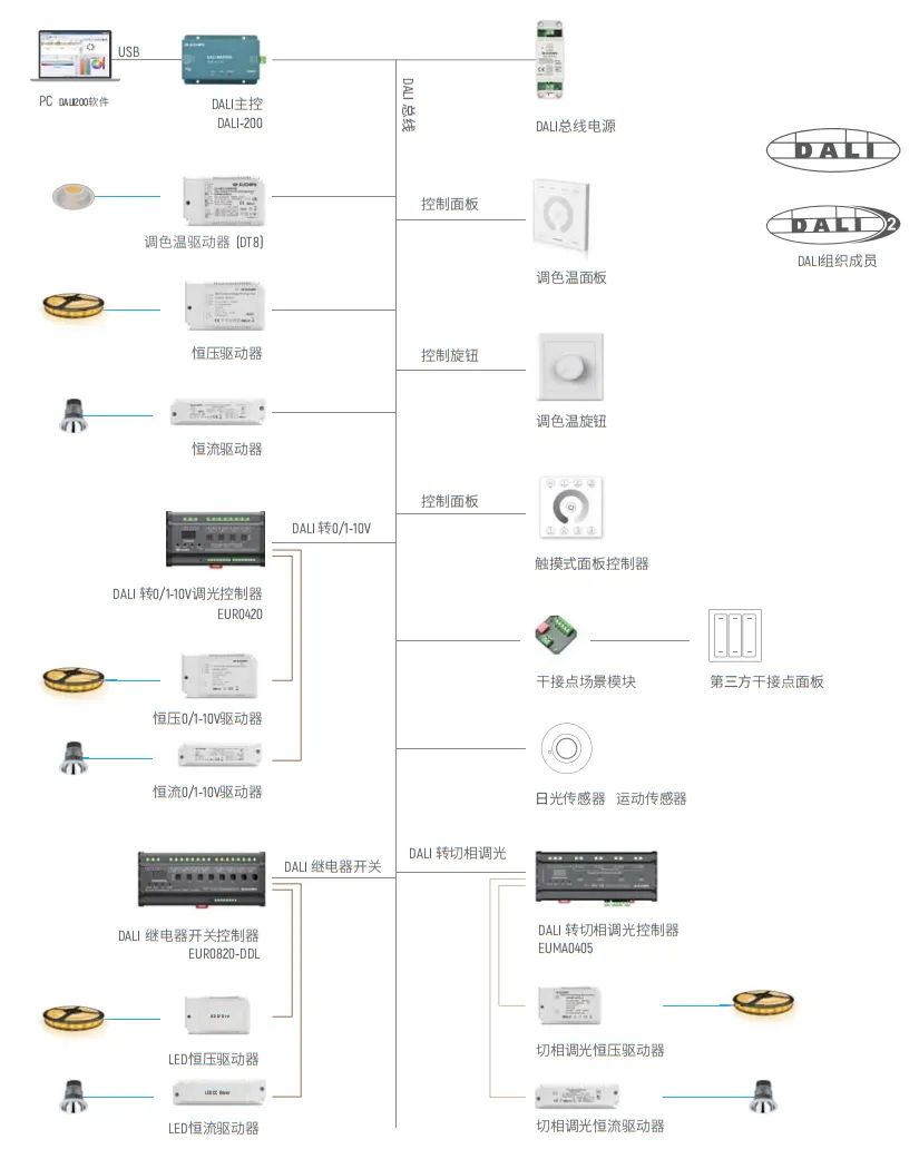 - 通過接入DALI接口的專用控制器或執行器實現智能化控制