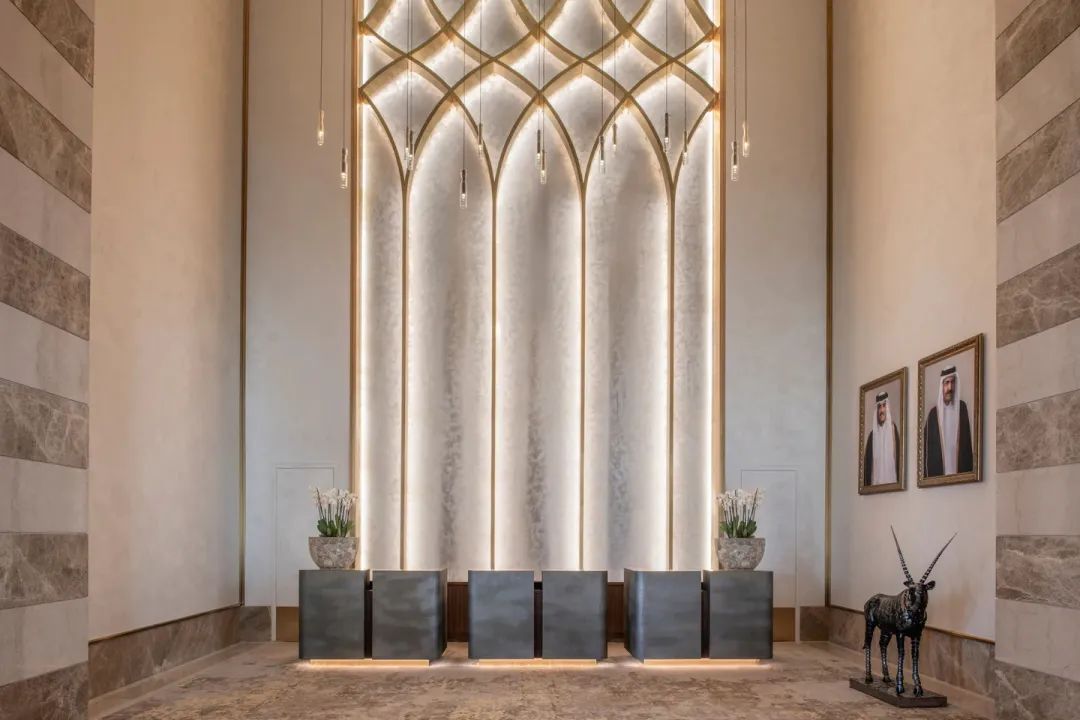 進入酒店,白色和米棕色為主的色調設計,隨處可見的阿拉伯風格的石柱,直立在大堂中。通過歐切斯調光電源,整體燈光明暗有致,營造出一種追求品質與不事張揚的高級豪華感。