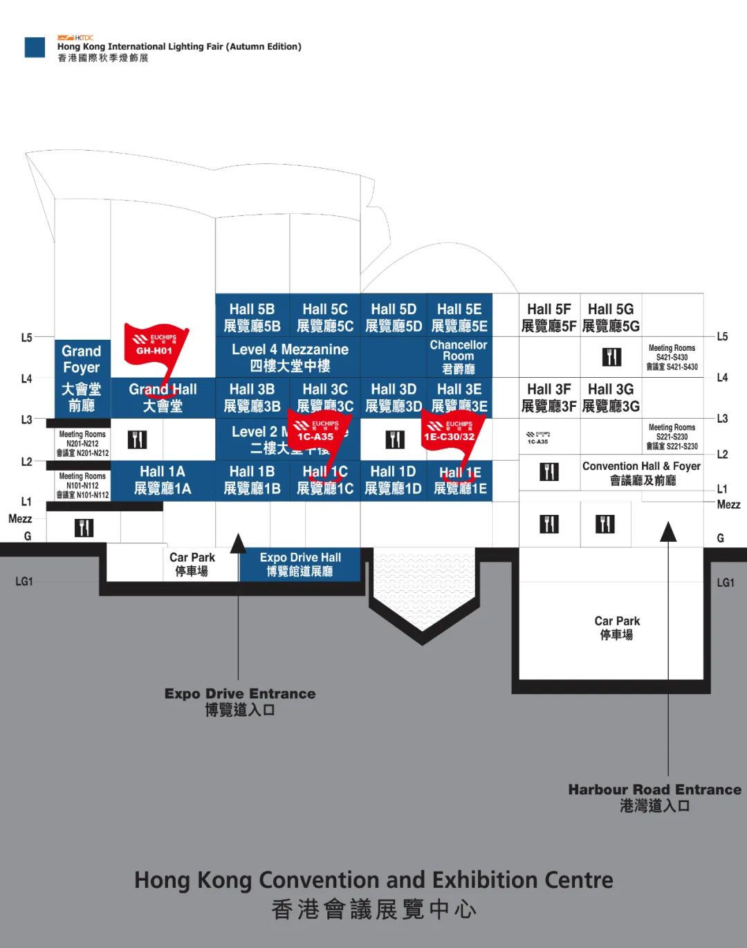 歐切斯展位1C-A35(一樓名燈薈萃廊)1E-C30/32(一樓名燈薈萃廊)GH-H01(三樓大會堂互聯照明專區)