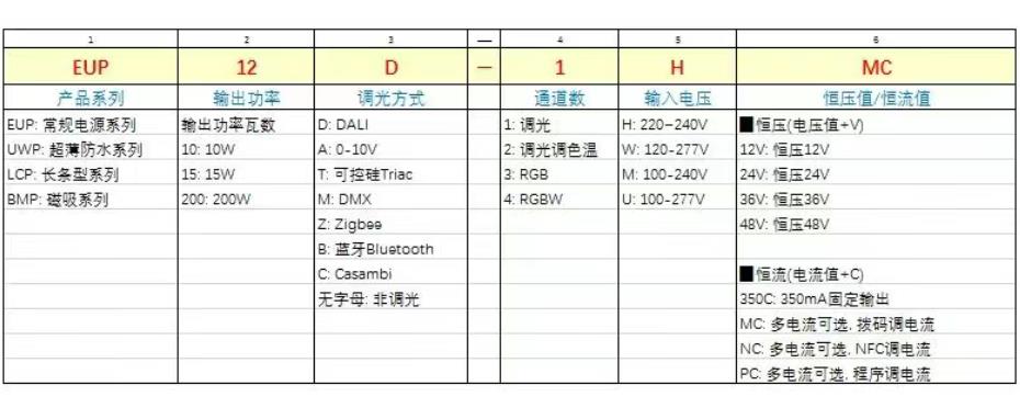 以EUP12D-1HMC為例:"EUP"代表歐切斯系列名稱"12"代表輸出功率12W"D"代表DALI調光"1"代表1通道,單色調光"H"代表輸入電壓220-240V"MC"代表恒流,多檔電流可選EUP12D-1HMC 就是DALI恒流調光電源,輸出功率12W,1通道,輸入電壓為220-240V,多檔電流可選。